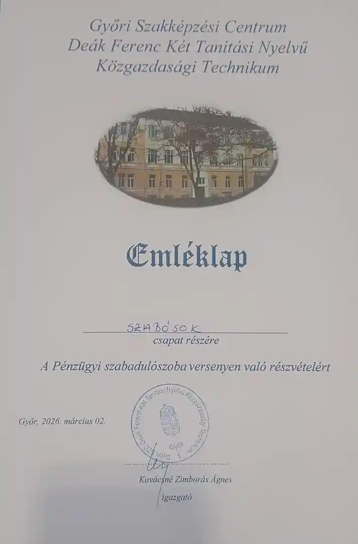 Naša škola, Spojená škola v Dunajskej Strede, prijala pozvanie z Deák Ferenc Két Tanítási Nyelvű Közgazdasági Technikum patriaceho pod Győri Szakképzési Centrum, kde sme sa v rámci podujatia PÉNZ7 – Týždeň finančnej a podnikateľskej gramotnosti zúčastnili zaujímavej finančnej súťaže. Cieľom podujatia bolo posilniť finančnú gramotnosť mladých ľudí a rozvíjať ekonomické a podnikateľské vedomosti hravou a zážitkovou formou.